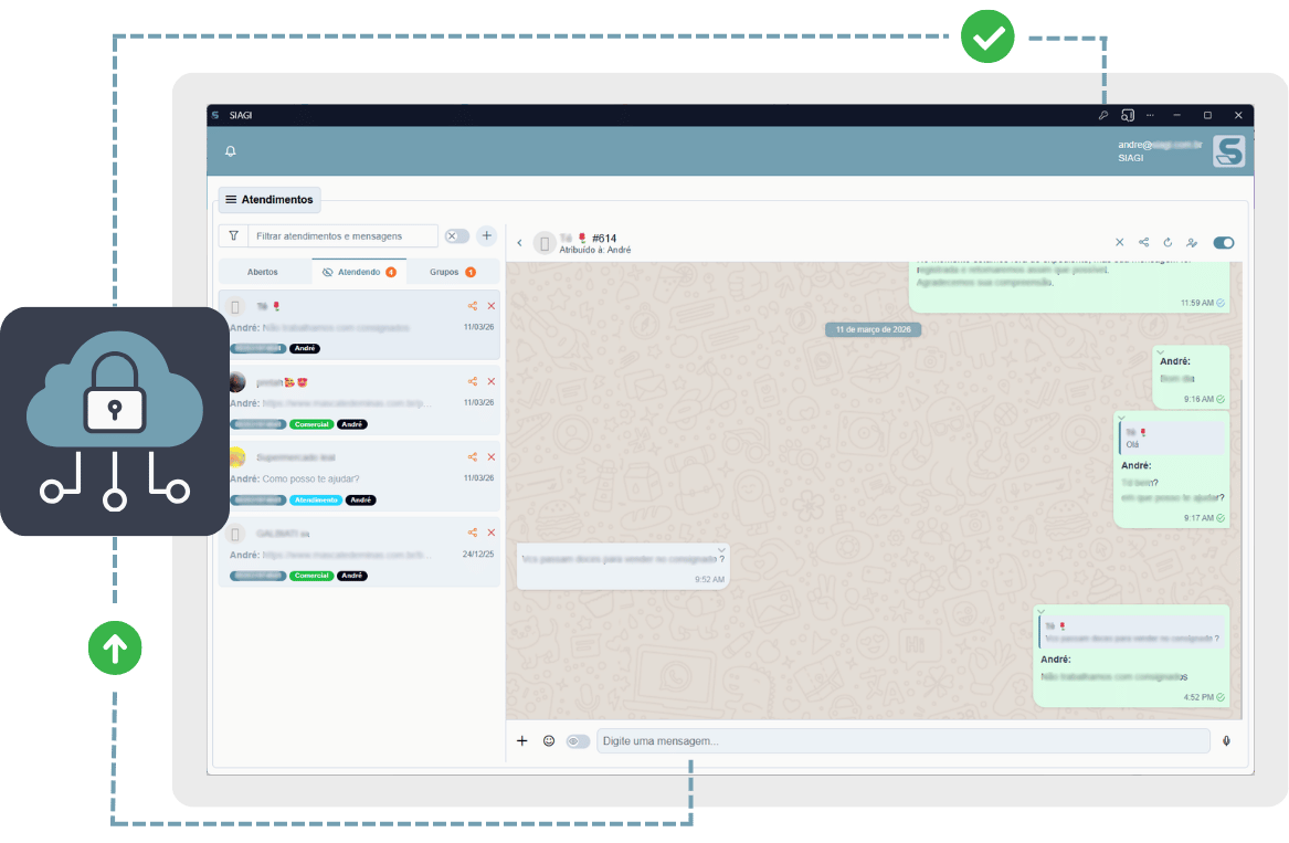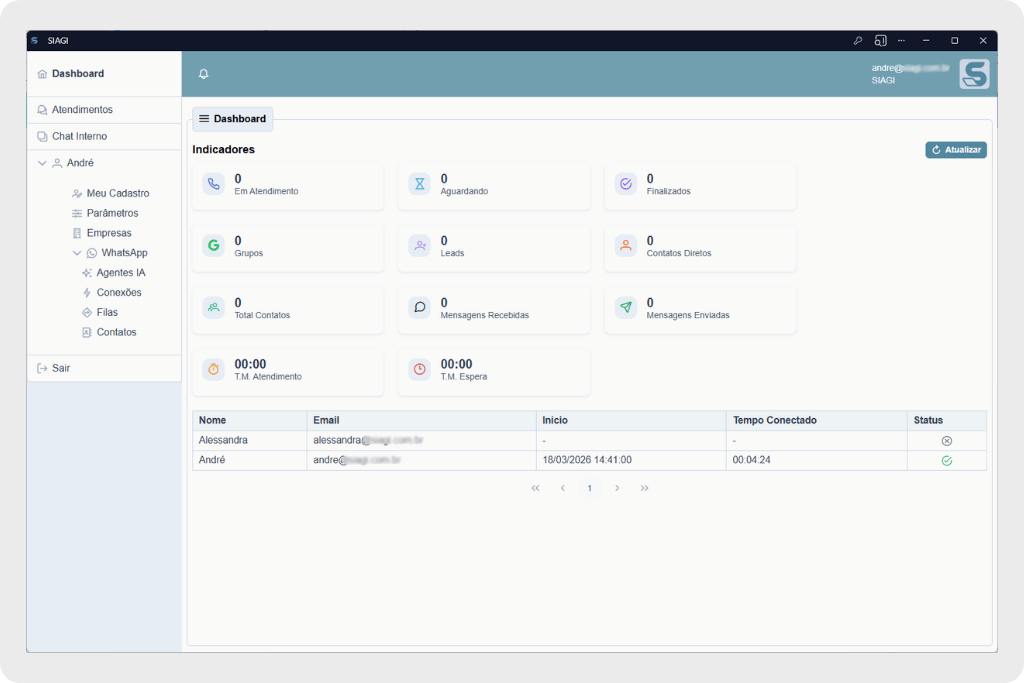 O SIAGI centraliza conversas do WhatsApp em um único painel, permitindo a gestão de atendimentos, operadores e filas com controle e organização em tempo real.
